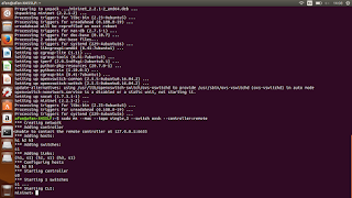 Jika sudah selesai akan muncul tampilan seperti diatas, selanjutnya jalankan suatu perintah yang digunakan untuk membuat suatu topologi dengan 3 host tanpa terhubung ke controller, dengan mengetikkan perintah “sudo mn –mac –topo single,3 –switch ovsk –controller= remote”